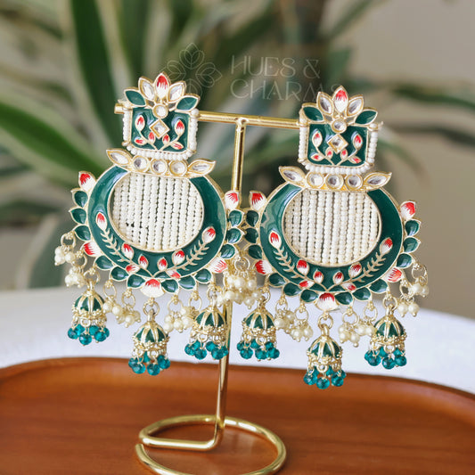 MEENAKARI EARRINGS WITH TRI JHUMKA - GREEN