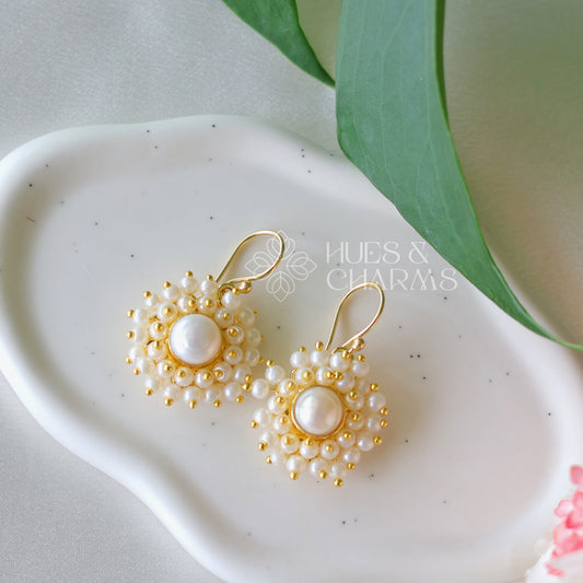 GOLDEN DAISY FLOWER DANGLER EARRINGS WITH PEARL