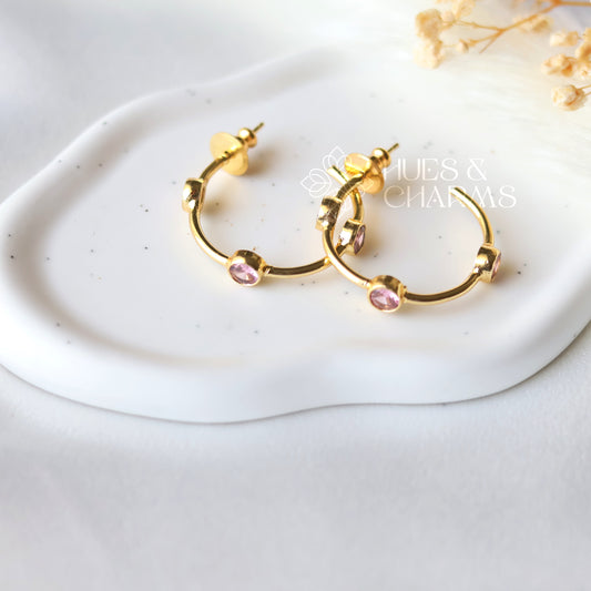 GLOSSY 3 STONE HOOP EARRINGS- PINK