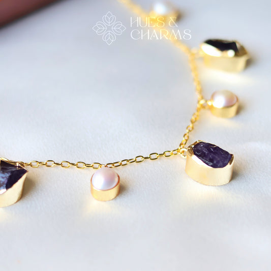RAW STONE WITH PEARL DROPS NECKPIECE- AMETHYST