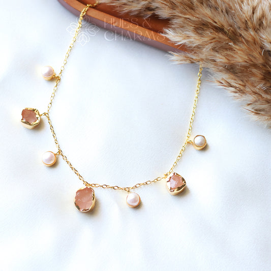 RAW STONE WITH PEARL DROPS NECKPIECE- ROSE QUARTZ