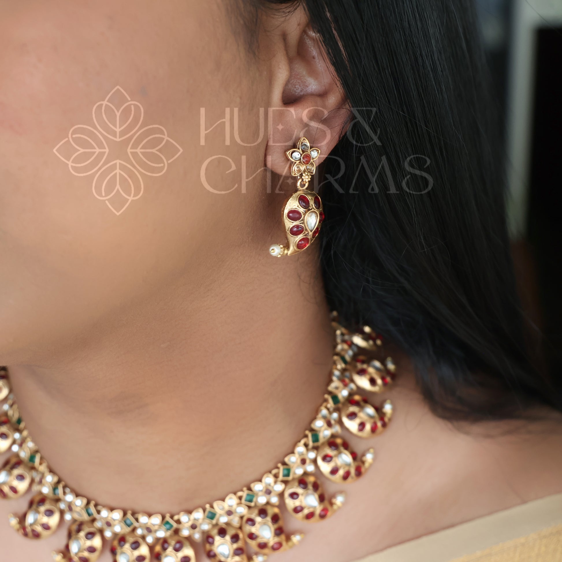 This necklace set combines traditional palakka in beautiful flocal flowers and mango designs with a traditional style. Golden accents and enamel detailing with kemp stones add a touch of elegance. Perfect for the festive season, this one-of-a-kind statement piece is a must-have for the trendsetters. Includes matching earrings.