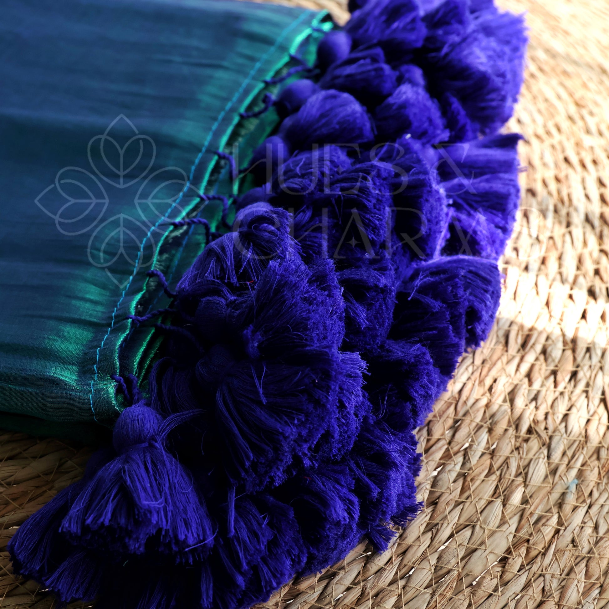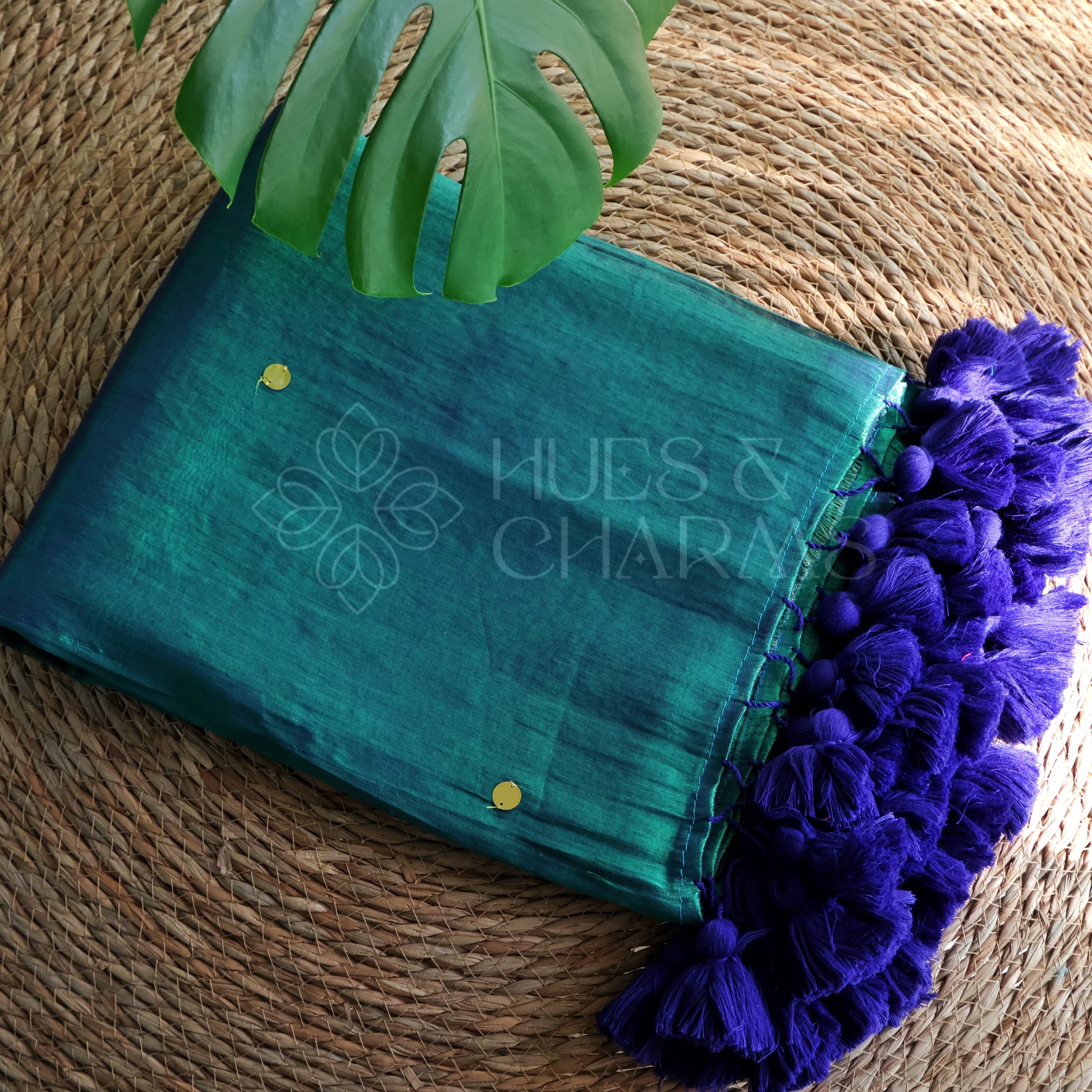 Discover the elegance of the Soft Tissue Saree - Mayuri, crafted from delicate raga tissue fabric. Featuring a captivating double-shaded peacock hue, this saree exudes sophistication perfect for festive occasions. Its handcrafted tassels add a refined artisanal touch, making it a timeless addition to your wardrobe. Embrace both comfort and style with this beautifully designed saree, ideal for celebrations and special events.