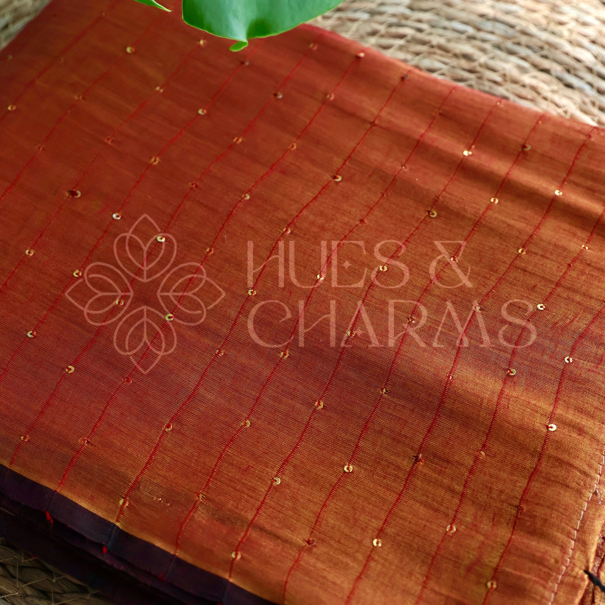 Woven with love and tradition — this double shaded beautiful raga tissue saree features a fine dark maroon border and a beautiful handmade tassels. Lightweight and festive-ready, it’s the saree you will keep reaching for.