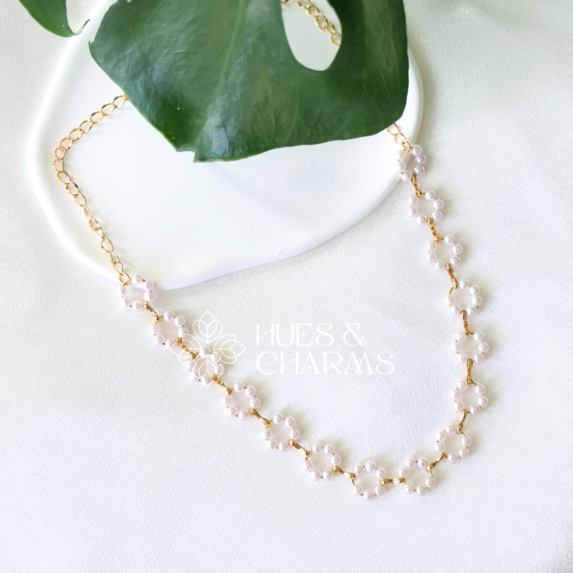 This Golden Flora Minimal Neckpiece is a unique and elegant piece that features a beautiful floral design in pearl. Its minimal and adjustable design makes it a versatile accessory that can be paired with any outfit. Elevate your style with this stunning neckpiece.