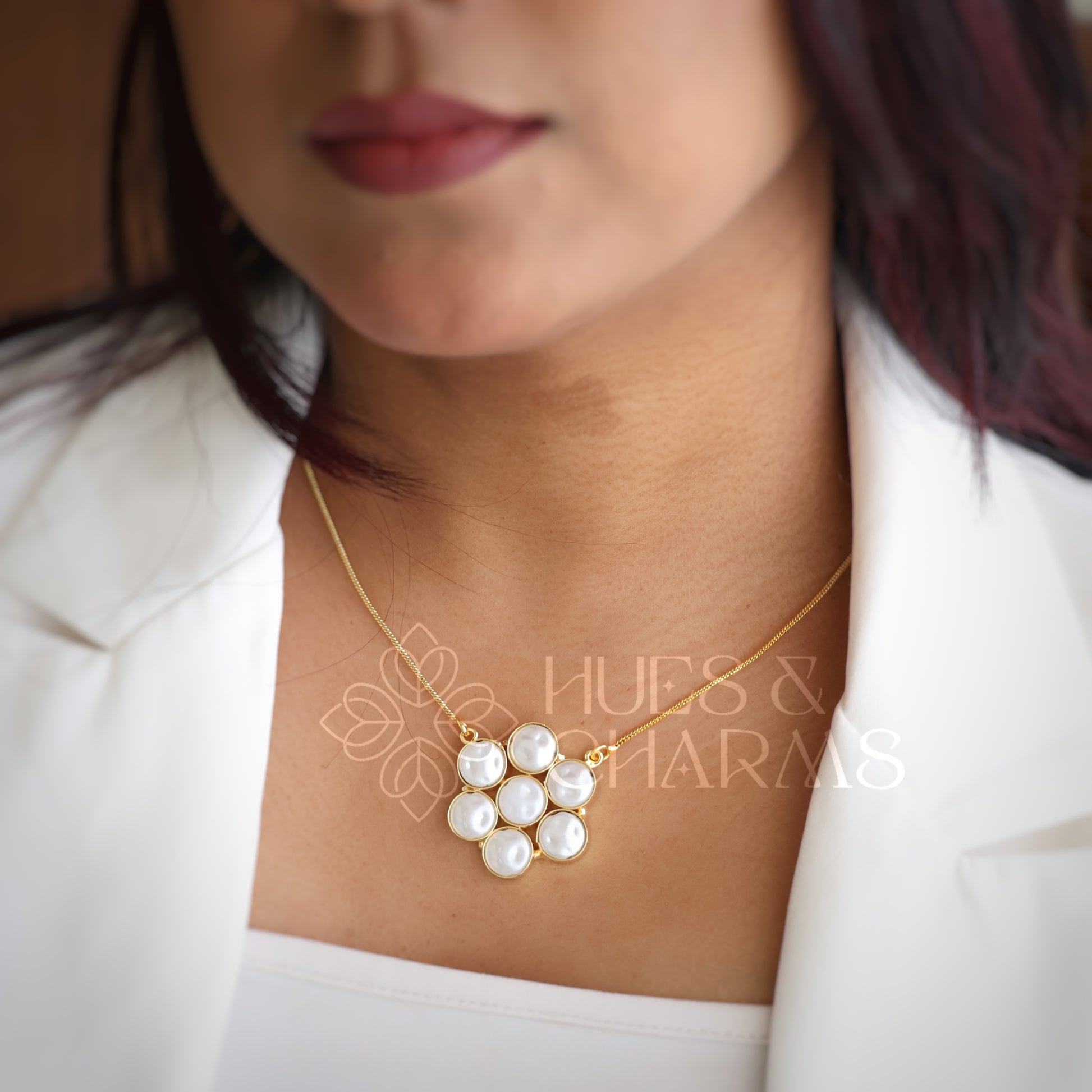 Experience the luxury and elegance of our newest 7 pearl Celeste pendant Neckpiece. Adorned with seven beautiful and unique pearls, this pendant is sure to make a statement. Its golden hue adds a touch of glamour to any outfit. A must-have for any jewelry collection.