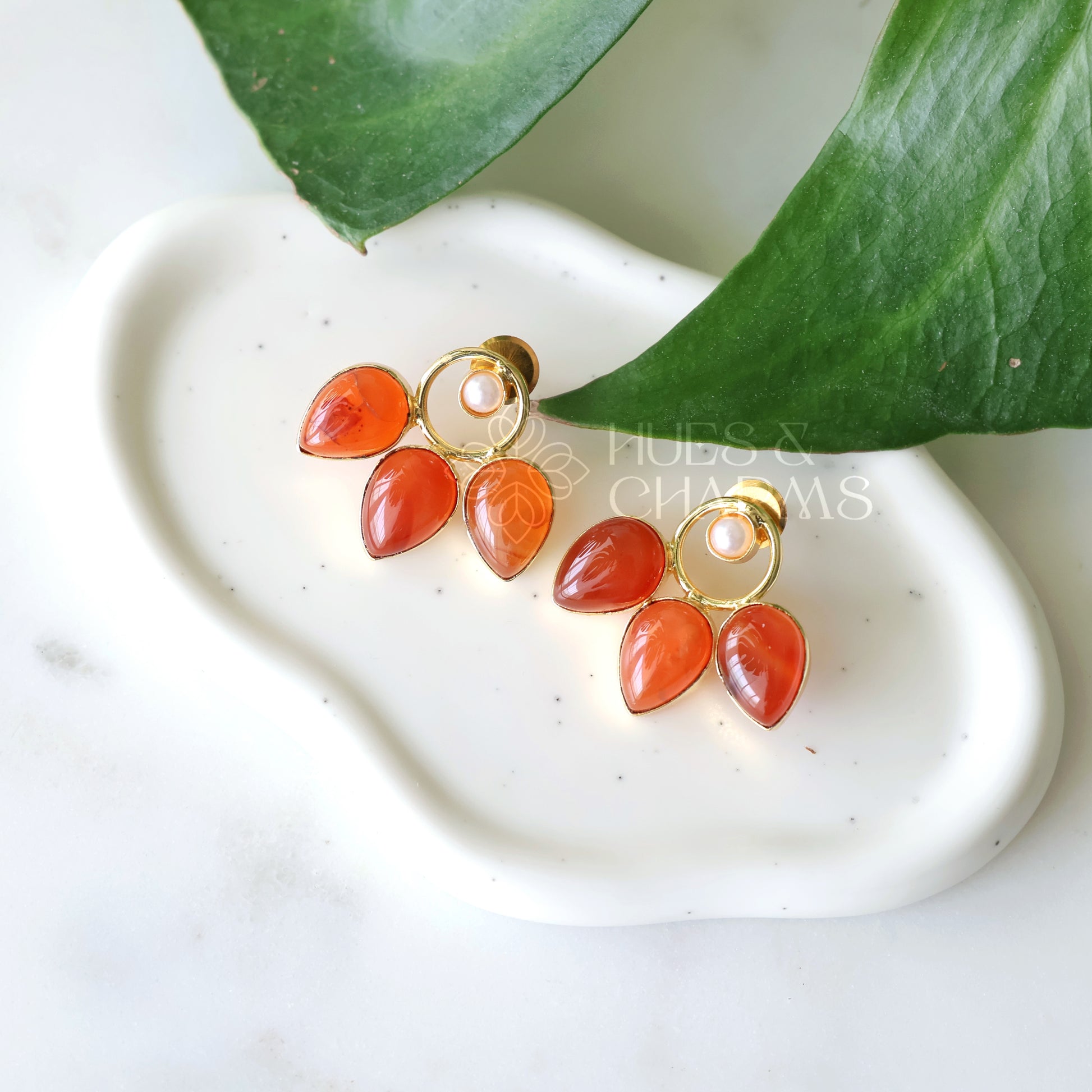 GOLDEN FLORA RAW STONE DROP EARRINGS WITH PEARL (COLOURS AVAILABLE)