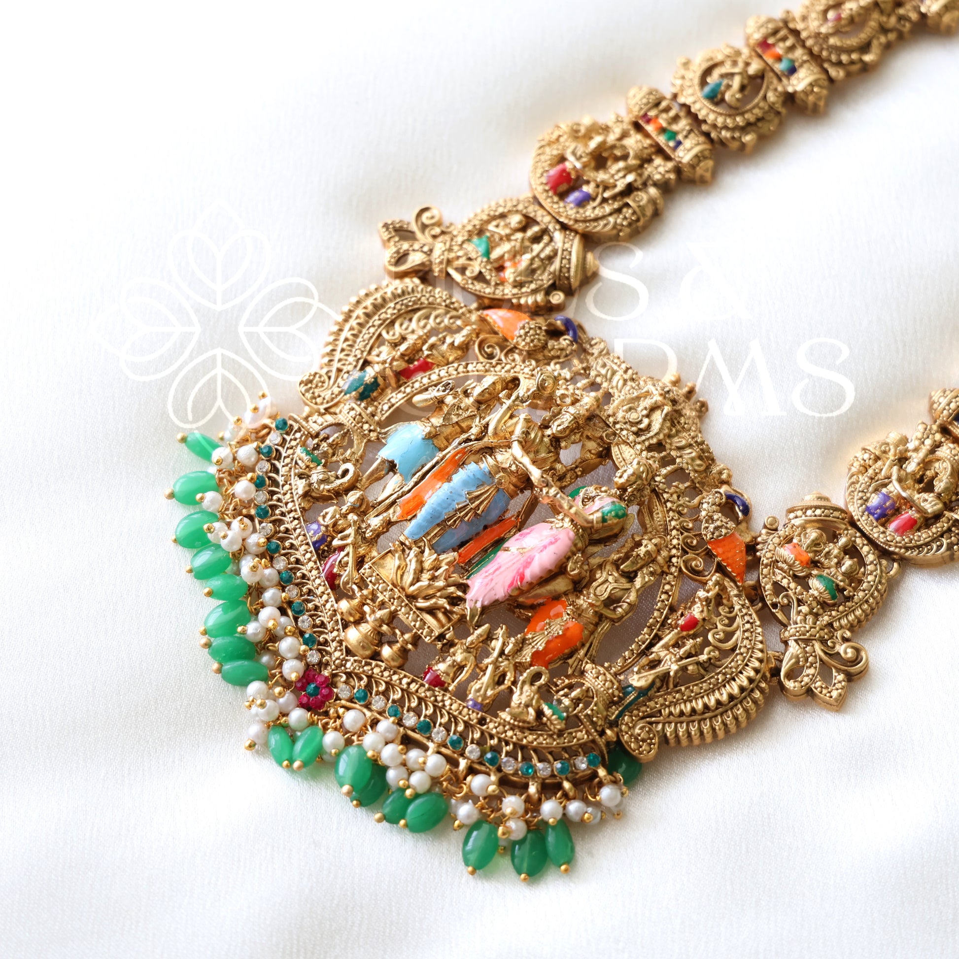 The Srinivasa kalyanam haaram embodies traditional craftsmanship, featuring intricate hand-painted detailing complemented by pearl accents. This golden heritage piece is designed to reflect cultural significance while enhancing your collection with matching earrings. Its exquisite artistry makes it a distinguished choice for formal occasions, elevating aesthetics by 100%.