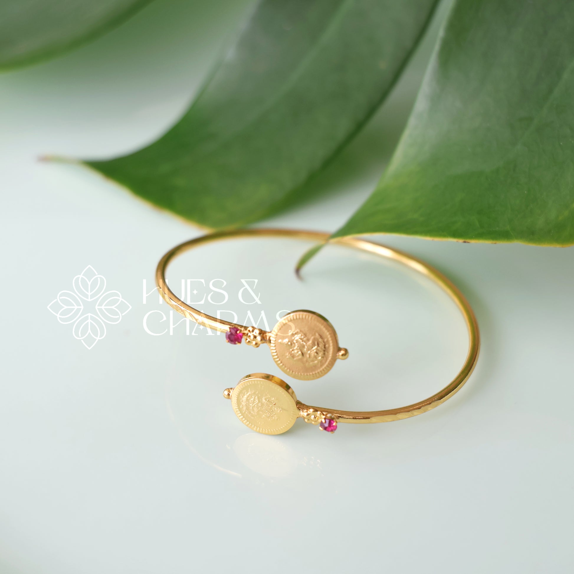 Experience the timeless elegance of our Traditional coil Adjustable Bangle. Plated in luxurious gold, this beautiful bangle is adjustable to fit any wrist size. Its traditional lakshmi coin design features the iconic coin motif with ruby stones detailing .